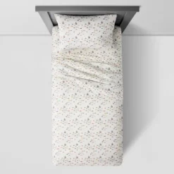 Speed up the comfort in your kiddo’s bedroom with the City Cars Cotton Sheet Set from Pillowfort™. Made with a brushed, 100% cotton fabric, this 220 thread count bed sheet set is soft to the touch, and it’s decorated with a colorful print of cars, road sign posts and buildings against a cream background to bring a dash of playful flair to their room. Perfect for year-round use, this car-print sheet set comes with a fitted sheet, flat sheet and matching pillowcase(s) for a complete look. The fully elastic fitted sheet is suitable for mattresses up to 16 inches deep to ensure a snug, secure fit and create a smooth, soft surface for your child to lay on. Machine-washable for easy care and cleaning, this bedding set is perfect for everyday use — add a solid or printed coverlet or comforter, and complete the look with various vehicle-shaped stuffed pillow buddies.